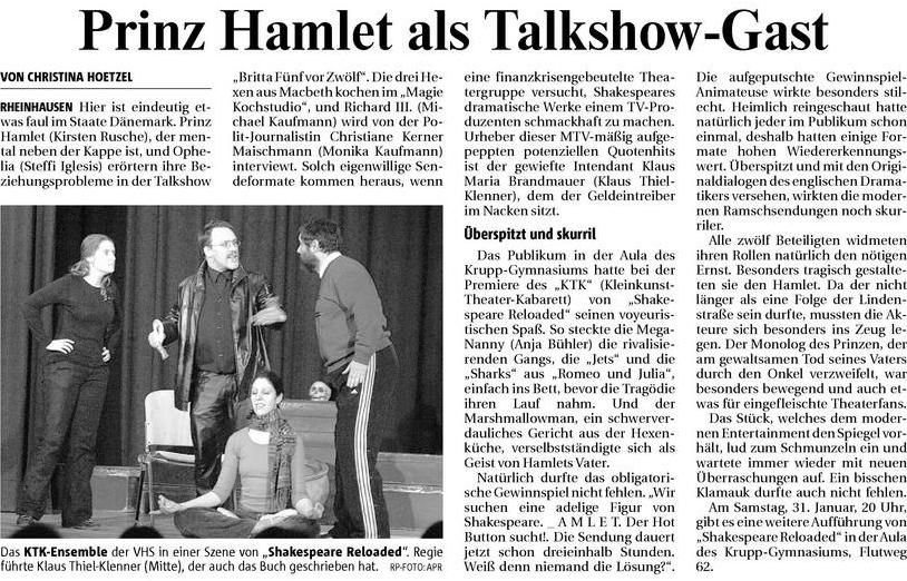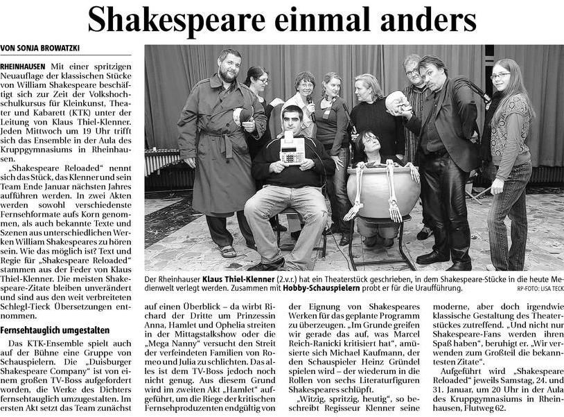 Ob Shakespeare wirklich ein Quotenhit sein kann? Wenn es nach dem Rheinhauser Publikum geht, dann Ja: Die Besucher in der Aula gingen auf jeden Fall begeistert mit und spendeten minutenlangen, frenetischen Beifall für eine geschlossen gute Ensembleleistung der „KTK“-Gruppe und ein intelligentes neues Stück, das nicht nur amüsante Medienkritik war, sondern auch für eingefleischte Theaterfans einige Leckerbissen bereit hielt. Ein rundum gelungener Theaterabend. „Wir werden das Stück ganz sicher nochmal spielen“, verspricht Regisseur und Autor Klaus Thiel-Klenner allen, die die Vorstellungen leider verpasst haben sollten.
